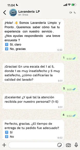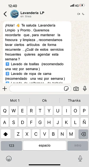 Con un bot inteligente disponible las 24 horas del día, los 7 días de la semana, tu lavandería puede ofrecer atención inmediata y personalizada a cada cliente, sin importar la hora o el día. El bot responde consultas frecuentes sobre servicios, tarifas y tiempos de entrega, y facilita la programación y confirmación de citas de forma automática. Esto no solo mejora la experiencia del cliente al eliminar esperas y llamadas telefónicas, sino que también reduce la carga de trabajo del personal, permitiéndoles enfocarse en tareas que requieren mayor atención humana. La disponibilidad continua del bot garantiza que ningún cliente quede sin respuesta, aumentando la satisfacción y fidelidad.